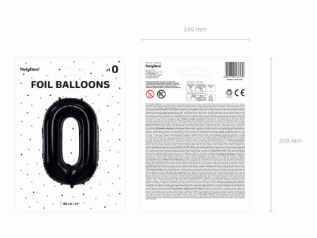 Balon foliowy metalizowany Cyfra ''0'' w kolorze czarnym, rozmiar przed napompowaniem ok. 100 cm (39''), rozmiar po napompowaniu ok. 86 cm (34''). Do napompowania powietrzem i helem.