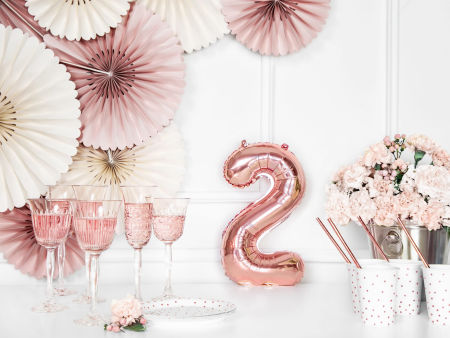 Balon foliowy metalizowany Cyfra ''2'' w kolorze różowego złota, rozmiar przed napompowaniem ok. 40 cm (16''), rozmiar po napompowaniu ok. 35 cm (14''). Do napompowania powietrzem.