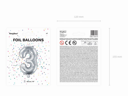 Balon foliowy metalizowany Cyfra ''3'' w kolorze srebrnym, rozmiar przed napompowaniem ok. 40 cm (16''), rozmiar po napompowaniu ok. 35 cm (14''). Do napompowania powietrzem.