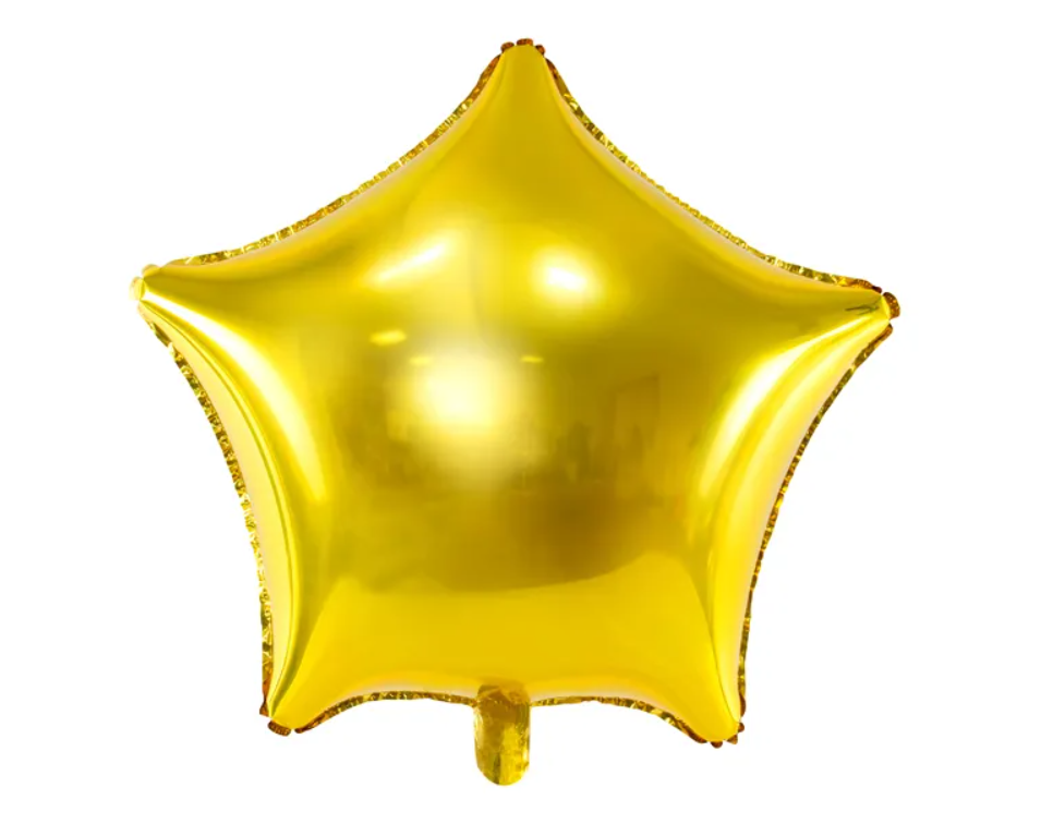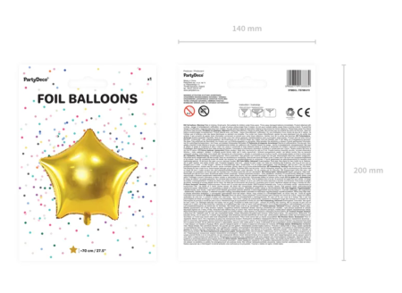 Balon foliowy metalizowany w kształcie gwiazdki w kolorze złotym, wysokość przed napompowaniem ok. 84 cm (33''), wysokość po napompowaniu ok. 70 cm (27.5''). Do napompowania powietrzem i helem.