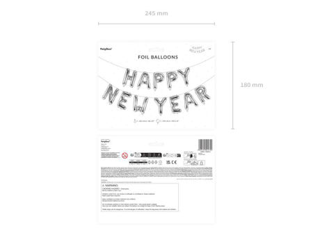 Balon foliowy metalizowany Happy New Year w kolorze srebrnym.