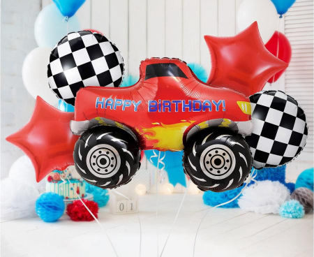 • Rozmiar w calach: 30” (balon monster truck), 19” (balony gwiazdy 2 sztuki), 18” (balony okrągłe 2 sztuki)