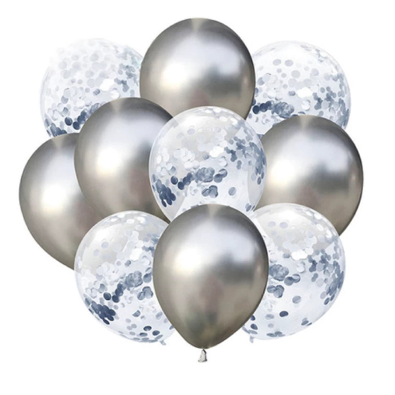 Opakowanie zawiera 10 sztuk balonów (5 szt. balonów transparentnych ze srebrnym konfetti i 5 balonów chromowanych - ciemny srebrny)