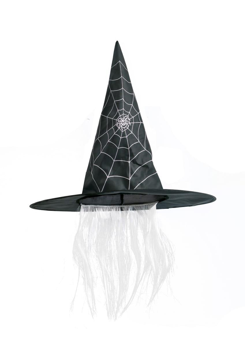 Czarny kapelusz czarownicy z białą pajęczyną i pająkiem oraz białymi włosami.
