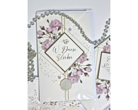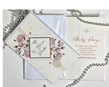 BestselleryNowościPromocjeO nasPrzepiękna i elegancka kartka Ślubna dla Młodej Pary z kwiecistym nadrukiem i złotym napisem. W środku piękne życzenia. Wzdłuż kartki śliczna złota wstążeczka z lakowaną pieczęcią. W zestawie koperta.