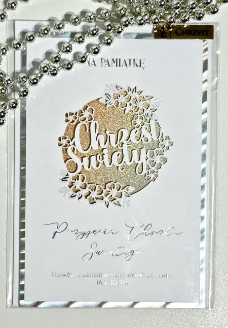 Przepiękna i elegancka kartka okolicznościowa na Pamiątkę Chrztu Świętego z ażurowym wzorem i pięknie mieniącym się w świetle nadrukiem w środku. Na około srebrna, mieniąca się lamówka i taki sam napis. Karnet, którym nie można się nie zachwycić :) Dodatkowo, w środku piękne życzenia. W zestawie koperta.