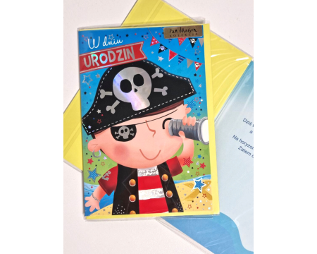 BestselleryNowościPromocjeO nasUrocza kartka urodzinowa dla dzieci z kolekcji Pan Dragon, z nadrukiem "wesołego pirata" i życzeniami w środku :). Zapakowana w kopertę będzie na pewno wymarzoną pamiątką. Podaruj bliskim odrobinę słodkości!