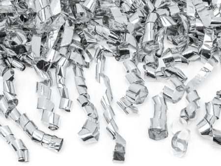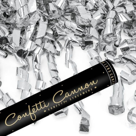 Z tuby wylatują srebrne serpentynki.