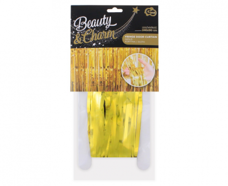 Lśniąca, foliowa kurtyna dekoracyjna w złotym kolorze. Kurtynę łatwo i wygodnie zamocujesz za pomocą taśmy przylepnej znajdującej się u góry. Wystarczy odkleić papierek zabezpieczający i przykleić kurtynę w wybranym miejscu. Mocy, a zarazem bezpieczny klej zapewni Ci trwałe mocowanie kurtyny, a jednocześnie bezproblemowy demontaż. Dzięki odpowiedniej długości 240 cm dopasujesz kurtynę do każdych drzwi, ściany i innych miejsc. Jednocześnie jest to optymalna długość, sprawiająca, że kurtyna nie będzie się plątać pod nogami i zbierać kurzu z podłogi.