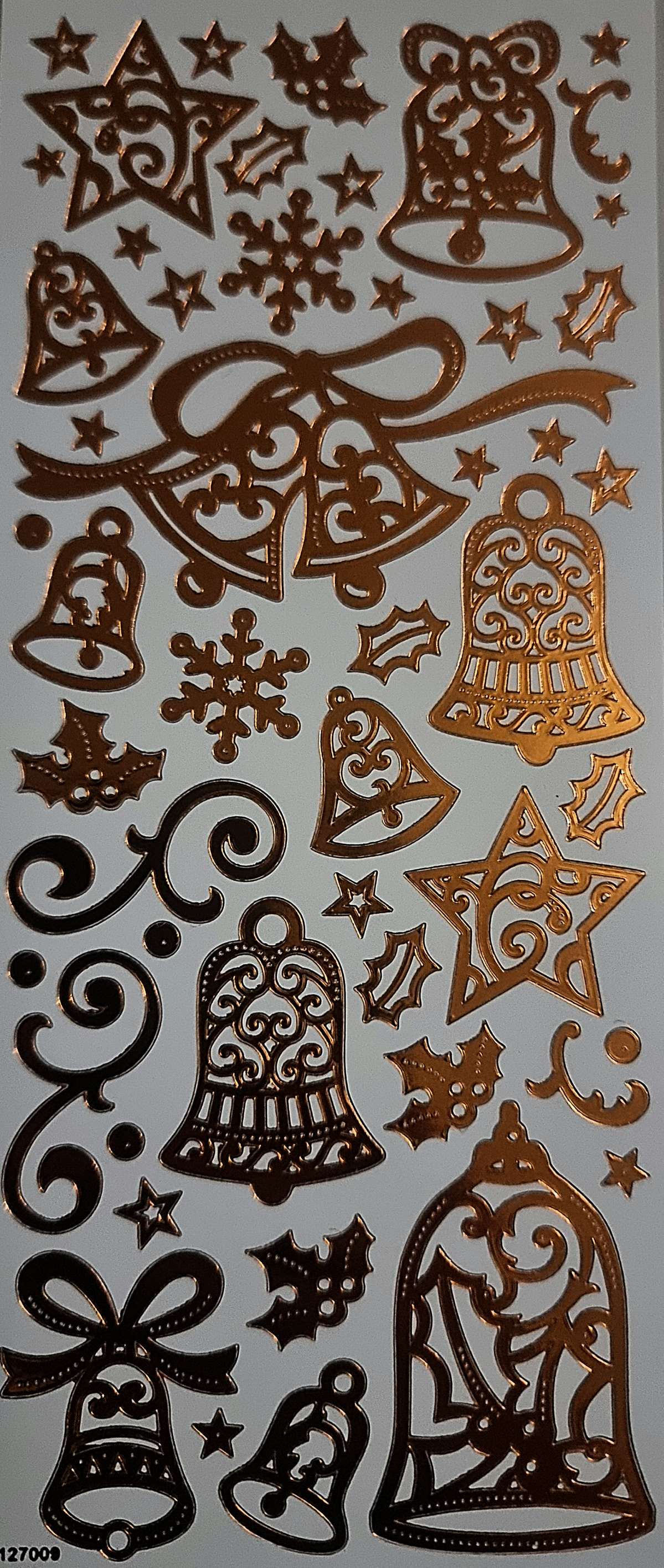 Naklejki ażurowe metaliczne, stickersy - dzwoneczki, gwiazdki, różowe złoto, arkusz 24x10
