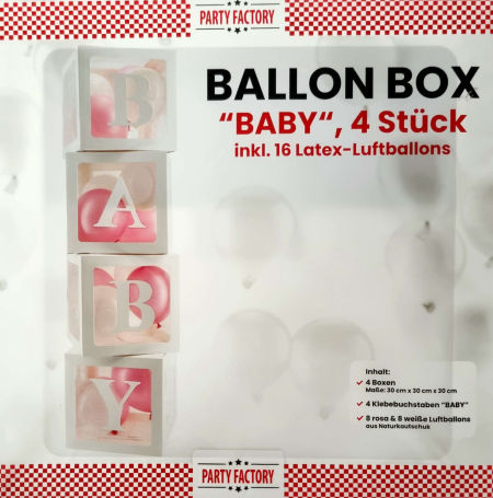 • Zawartość: 4 pudełka 30x30x30cm, 4 przyklejane litery BABY, 16 balonów z naturalnego kauczuku -> 8x różowe, 8x białe