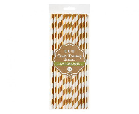 Zestaw 24 białych słomek do picia - zdobione wzorami różowozłotych pasków