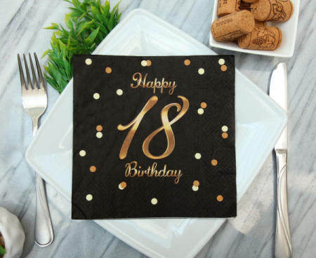 Serwetki B&C Happy 18 Birthday, czarne, nadruk złoty, certyfikat FSC, 33x33 cm/ 20 szt.