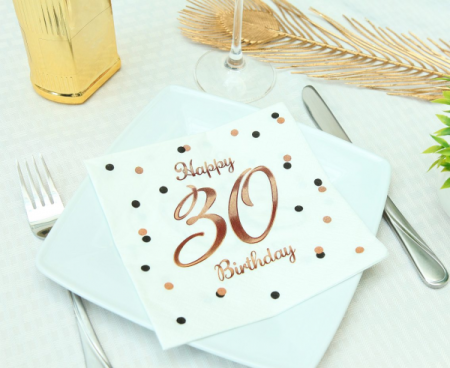 Serwetki B&C Happy 30 Birthday, białe, nadruk różowo-złoty, certyfikat FSC, 33x33 cm/ 20 szt.