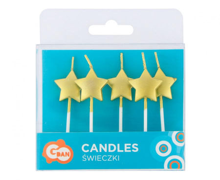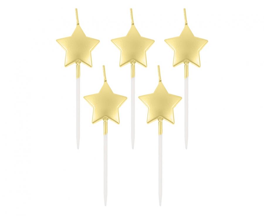 ŚWIECZKI PIKERY GWIAZDKI NA PATYCZKU, METALICZNE ZŁOTE, 5 SZT.