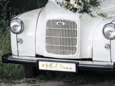 BestselleryNowościPromocjeO nasŚliczna, elegancka tablica rejestracyjna (papierowa) w kolorze białym ze złotym - lustrzanym napisem Młoda Para.