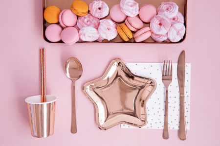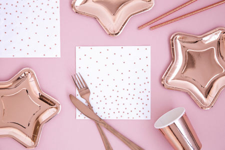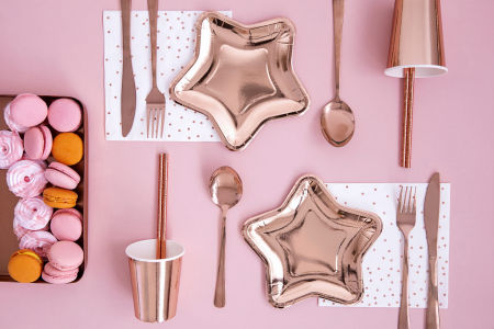 Talerzyki Gwiazdka wykonane z papieru metalizowanego w kolorze różowego złota, średnica ok. 18 cm