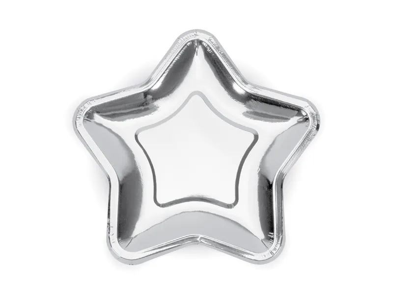 Talerzyki Gwiazdka wykonane z papieru metalizowanego w kolorze srebrnym, średnica ok. 23 cm.