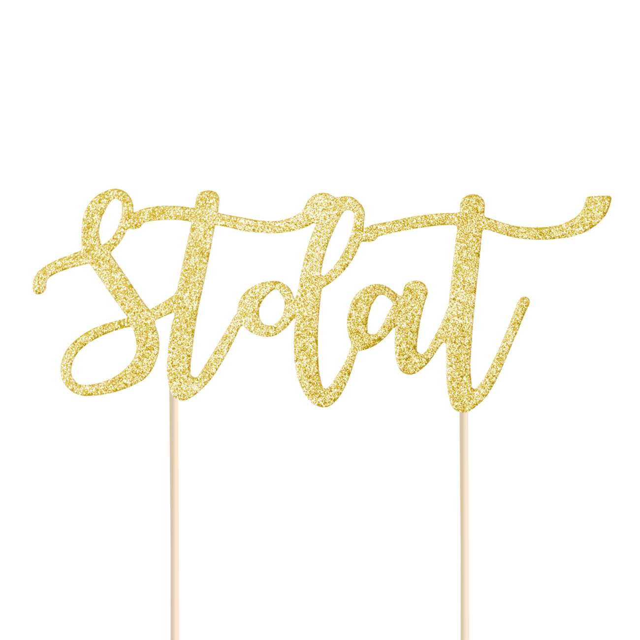 Topper na tort urodzinowy z napisem Sto lat w kolorze złotym.