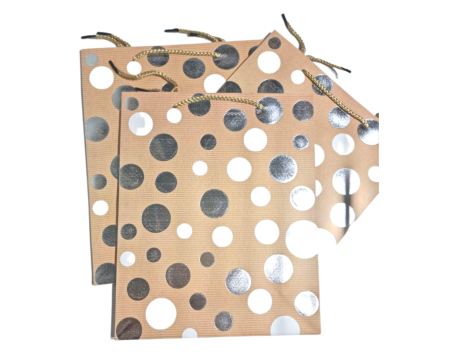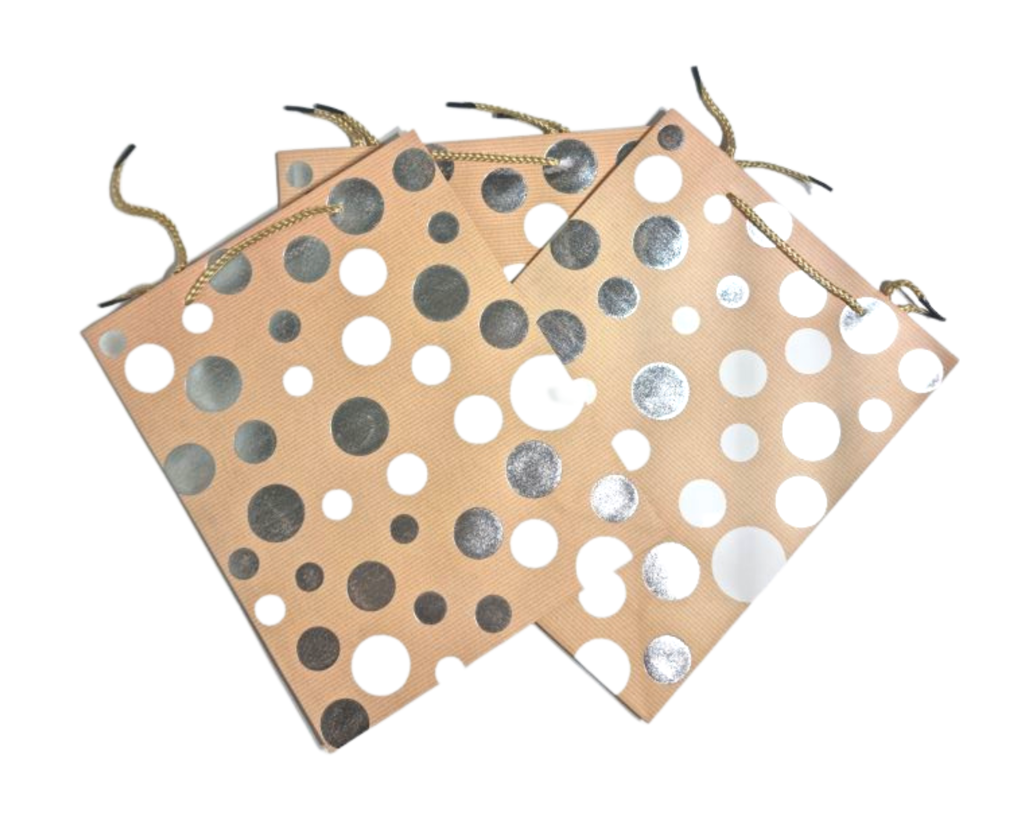 BestselleryNowościPromocjeO nasElegancka torebka prezentowa w odcieniach brązu/beżu w srebrne, błyszczące grochy.