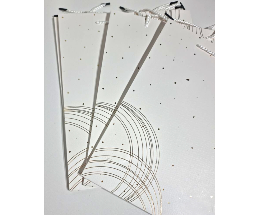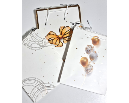 BestselleryNowościPromocjeO nasElegancka, złocona torebka prezentowa w białym kolorze z bardzo efektownymi, złotymi wzorami.