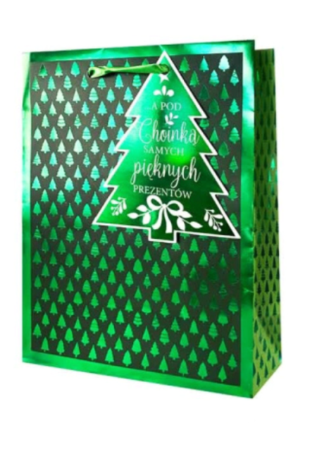 Torebka Prezentowa Boże Narodzenie 23x18cm, metalizowana, zielona, choinki
