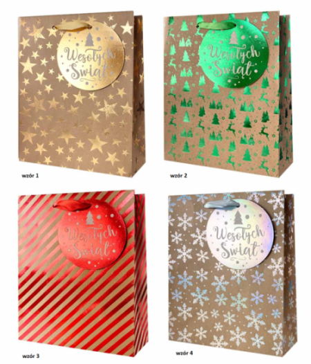 Przepiękna torebka prezentowa na Święta w kilku wzorach do wyboru. Metalizowane ranty i nadruki.