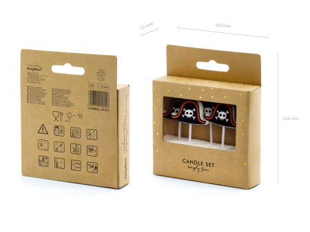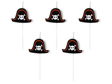 Świeczki na tort w kształcie pirackich kapeluszy. Odpowiedniej długości, dobrze odpalające się knoty pozwolą na szybkie i łatwe odpalenie świeczek w tym samym czasie.